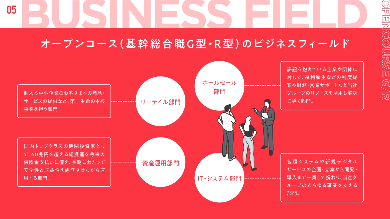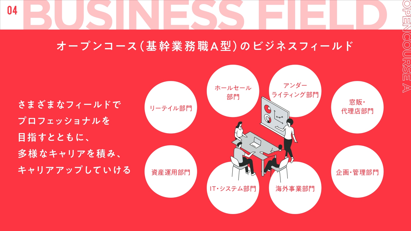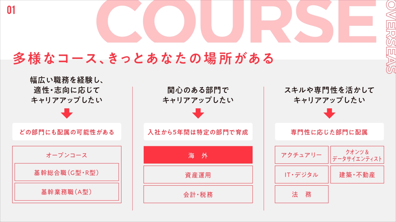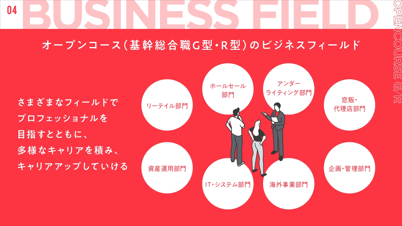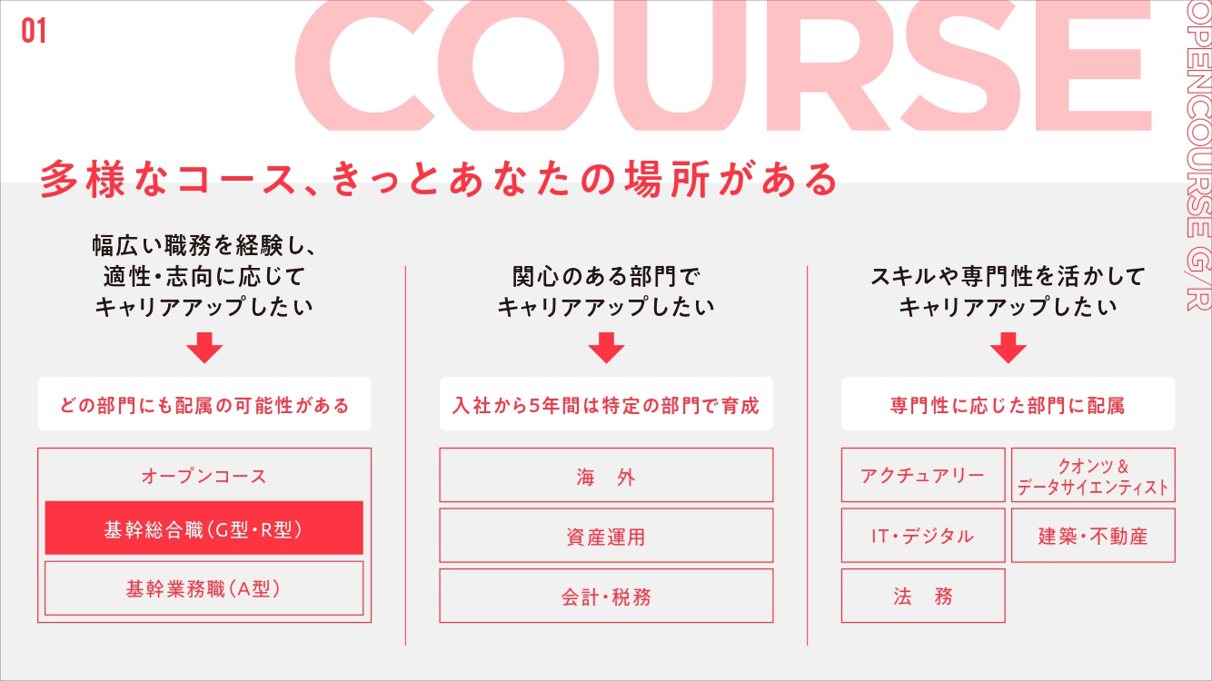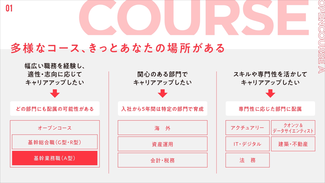 【オープンコース】基幹総合職(G型・R型)、アクチュアリーコース、建築・不動産コース、IT・デジタルコース、資産運用コース、海外コース、会計・税務コースの中からいずれか1つと併願が可能です。