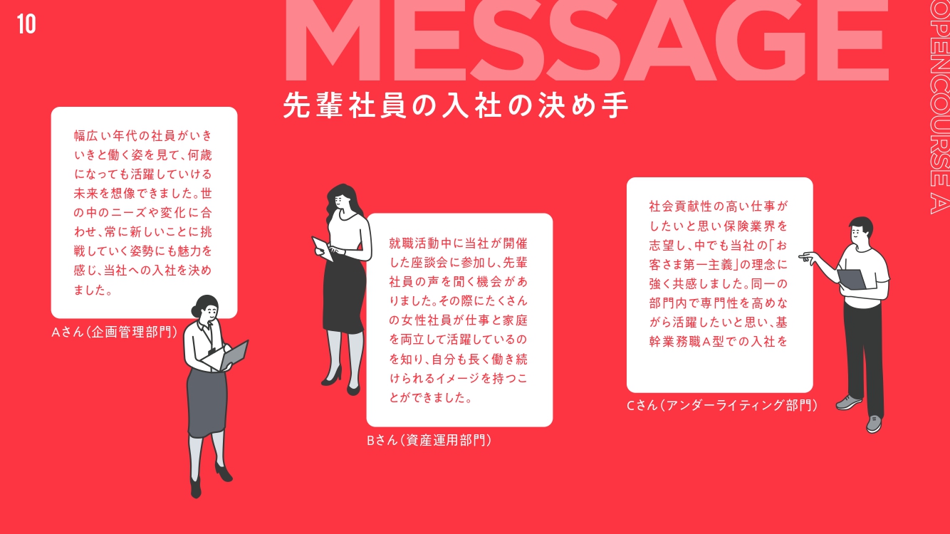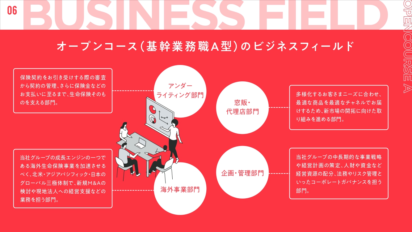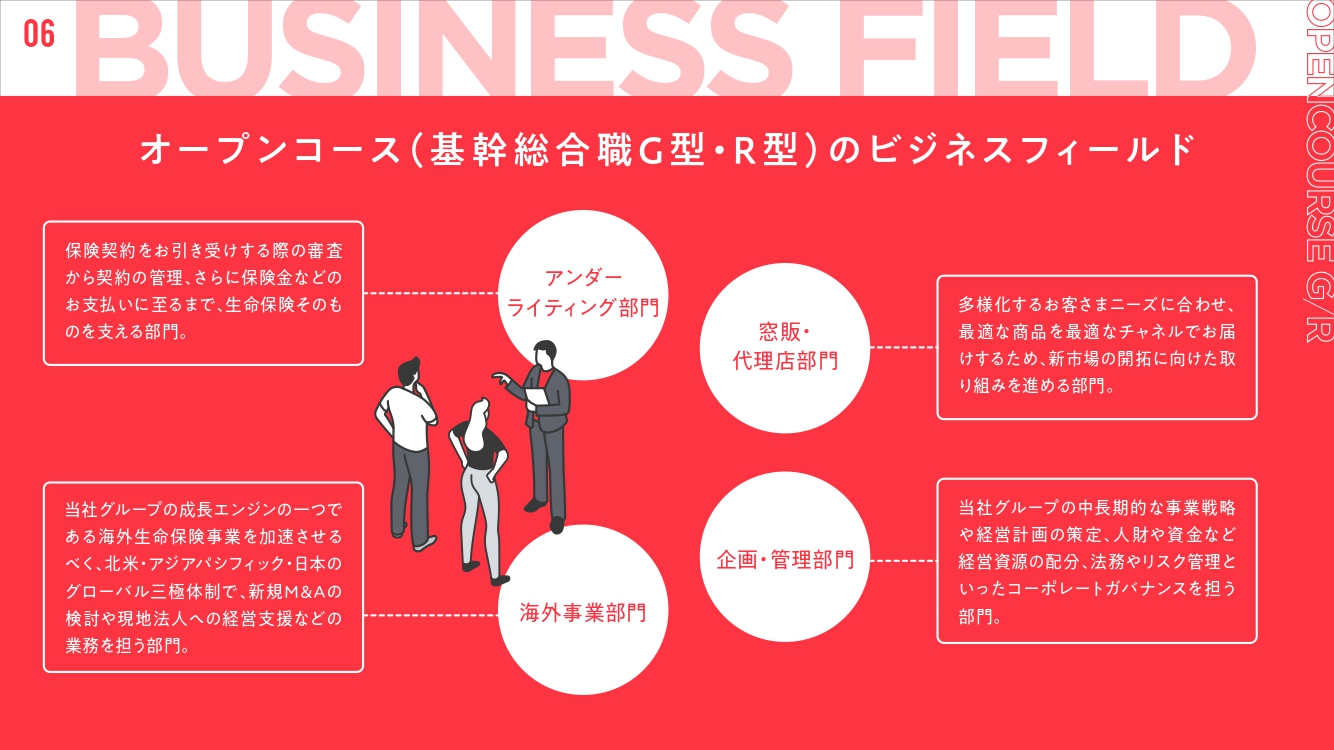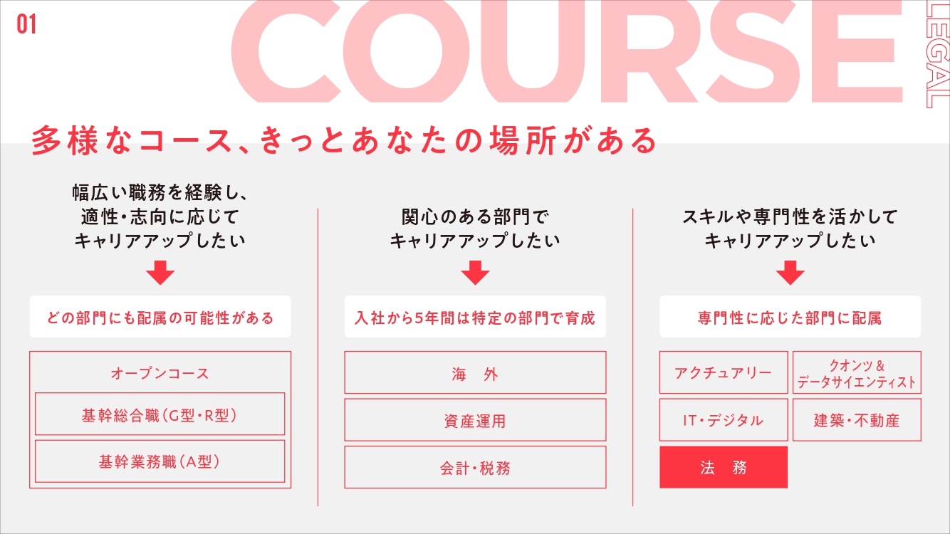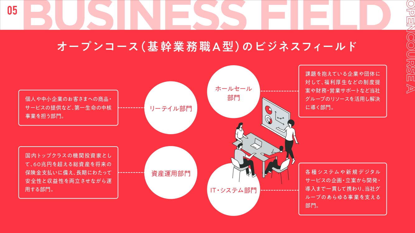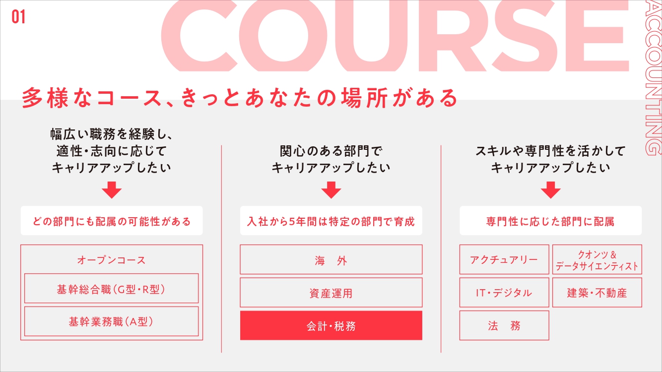 【オープンコース】基幹総合職(G型・R型)、アクチュアリーコース、建築・不動産コース、IT・デジタルコース、資産運用コース、海外コース、会計・税務コースの中からいずれか1つと併願が可能です。