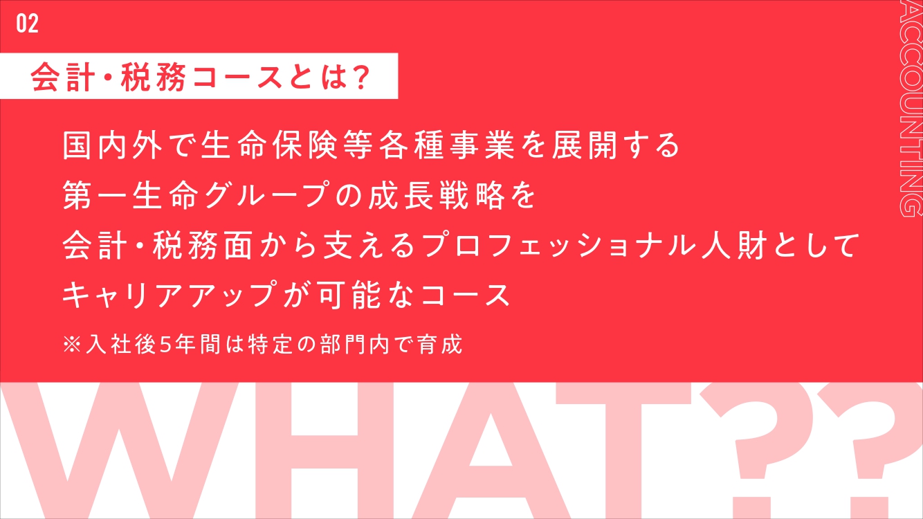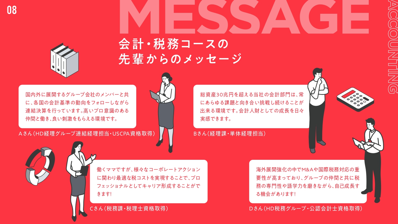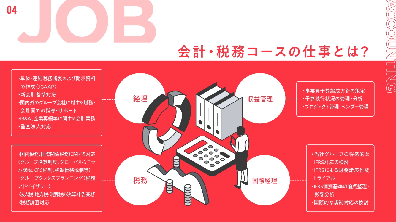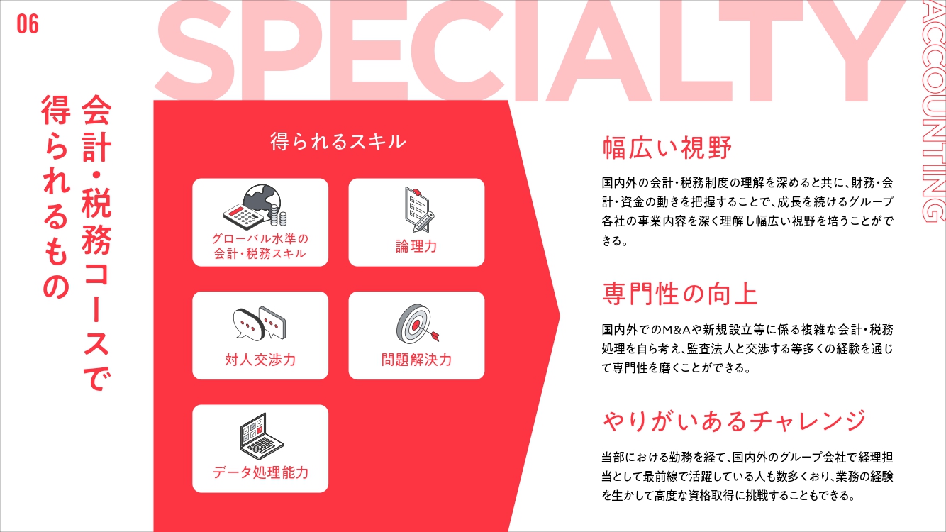 会計・税務に関わる特定部門にて業務経験を積み、国内外で幅広い事業を展開する当グループの成長戦略をファイナンス面から支えるスペシャリストとしてスキルアップが可能なコース