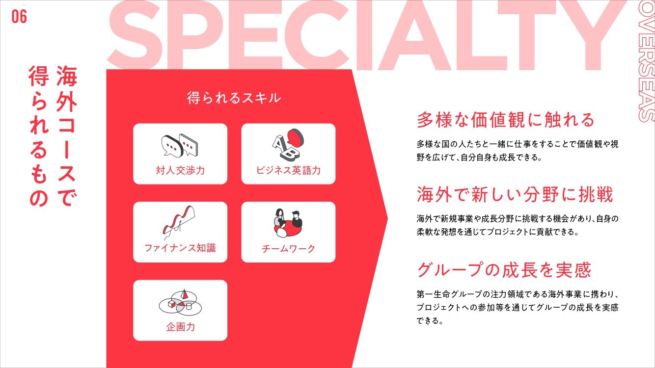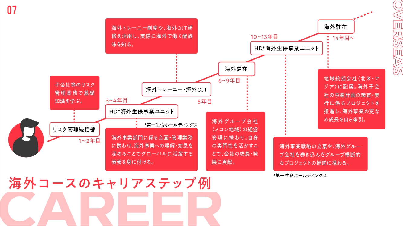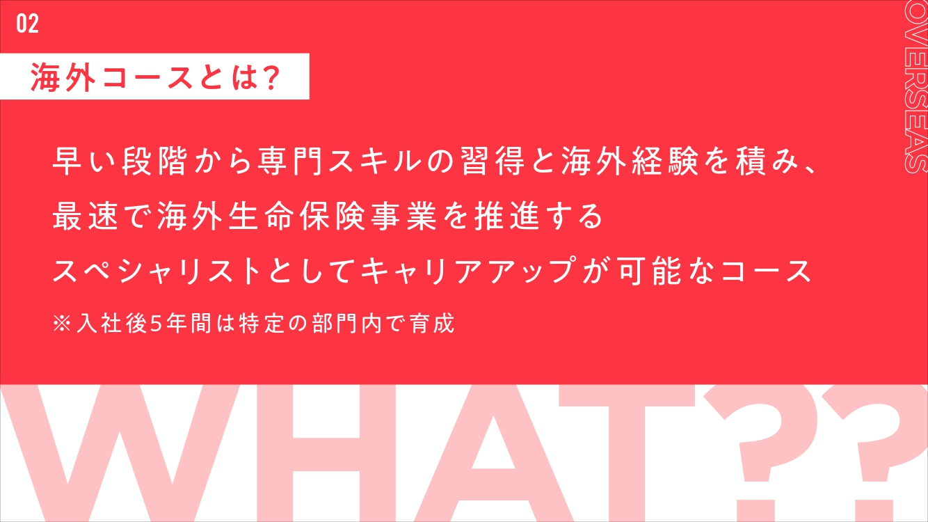 海外事業に関わる特定部門にて業務経験を積み、海外生保ビジネスを推進するスぺシャリストとしてスキルアップが可能なコース