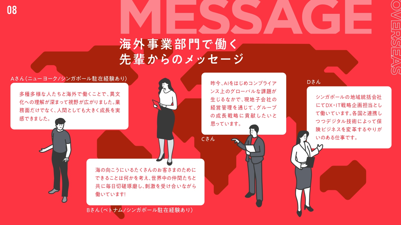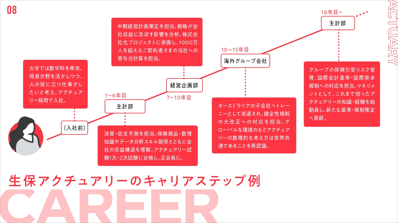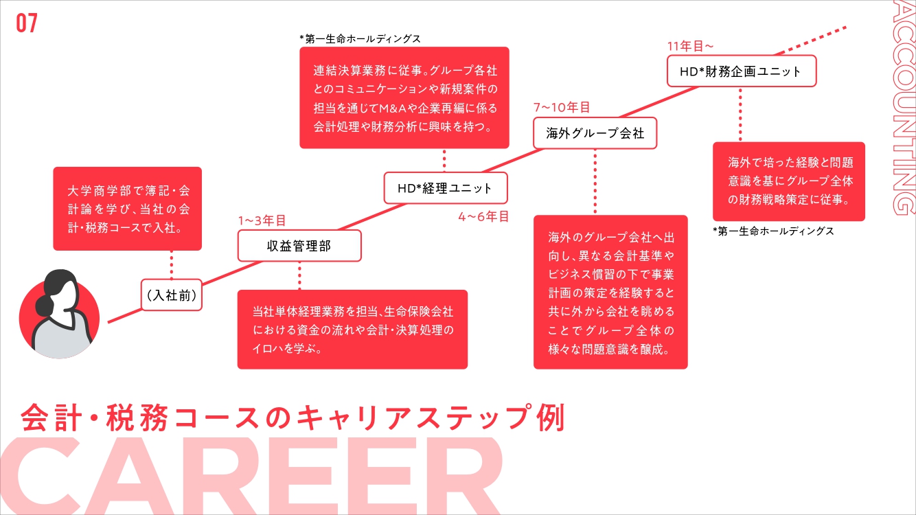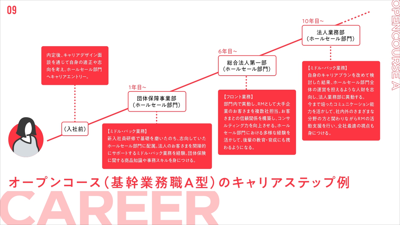 海外事業に関わる特定部門にて業務経験を積み、海外生保ビジネスを推進するスぺシャリストとしてスキルアップが可能なコース