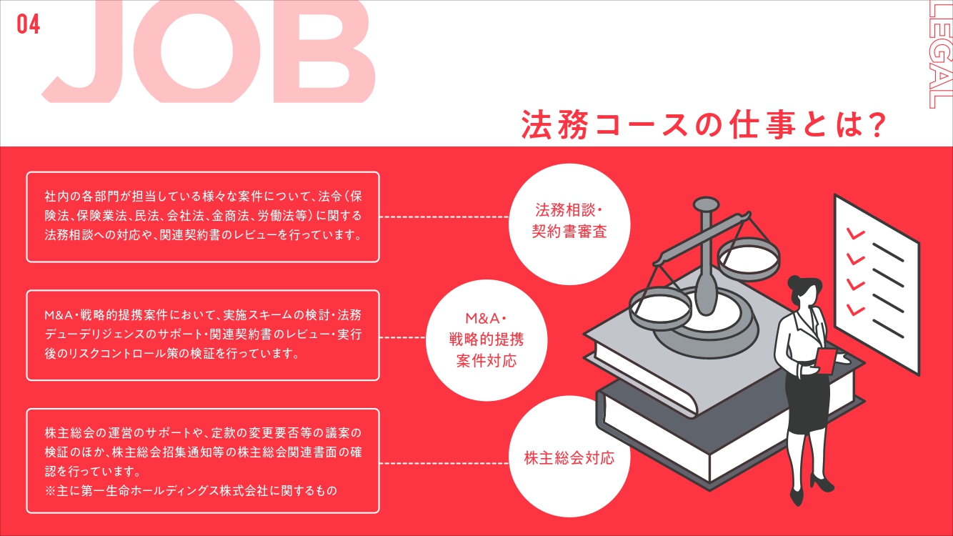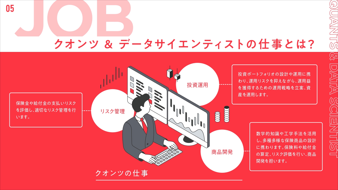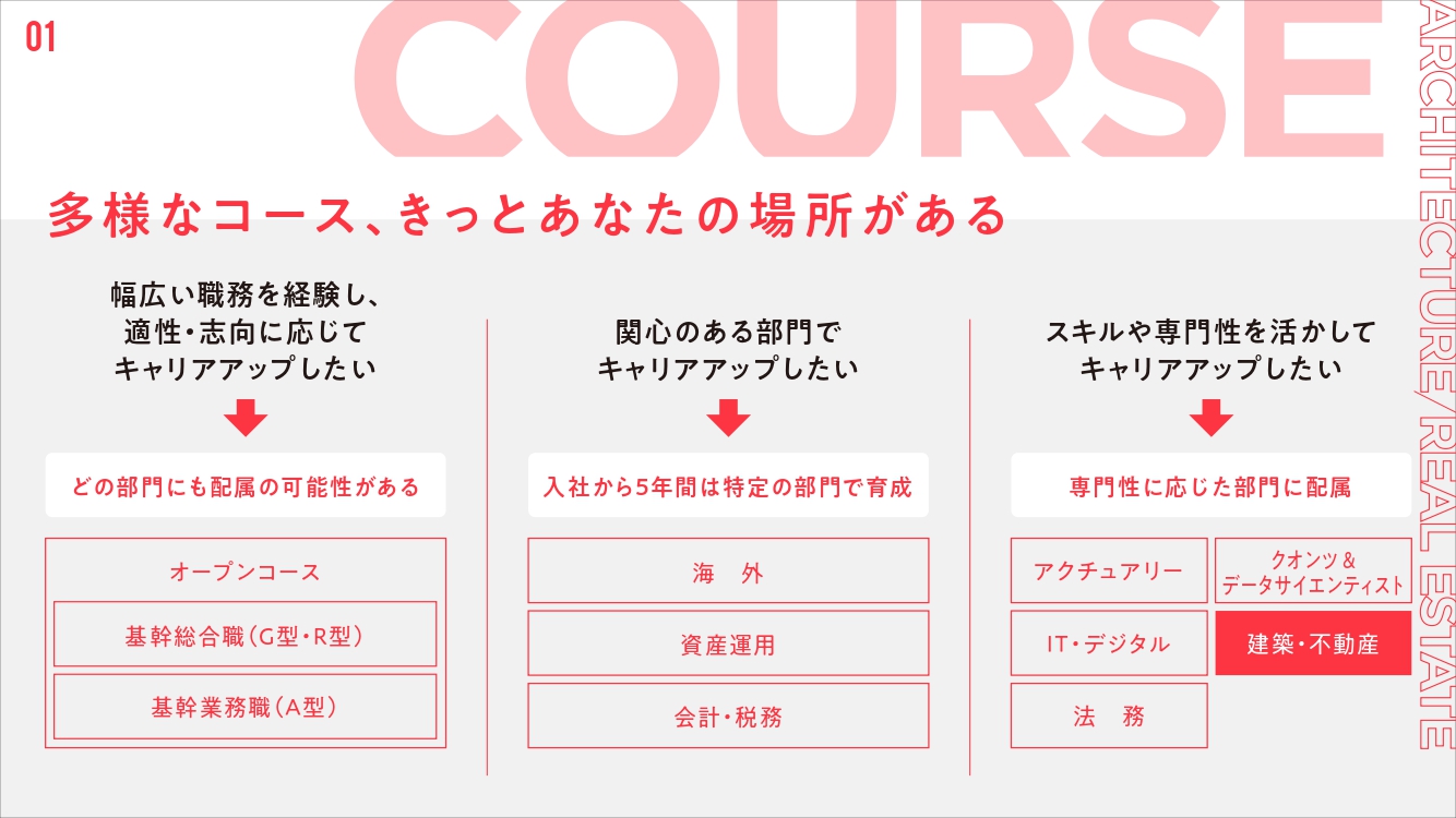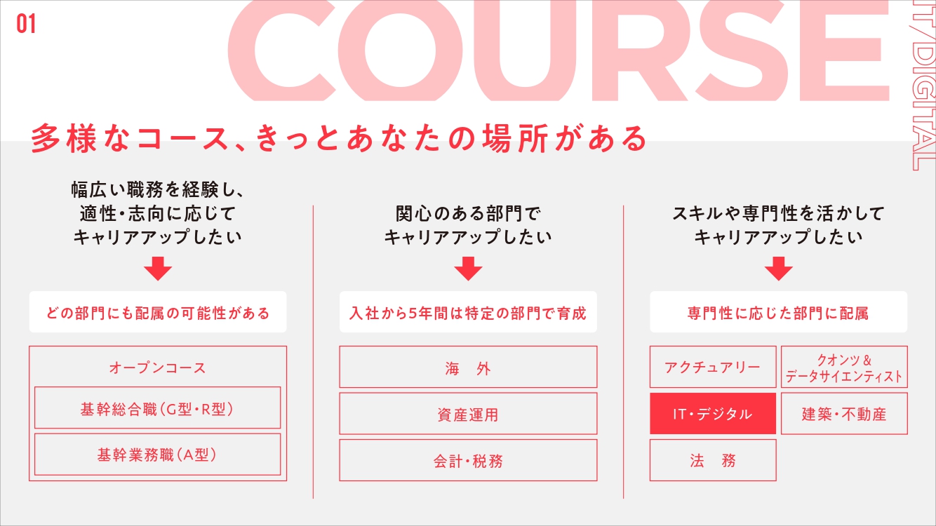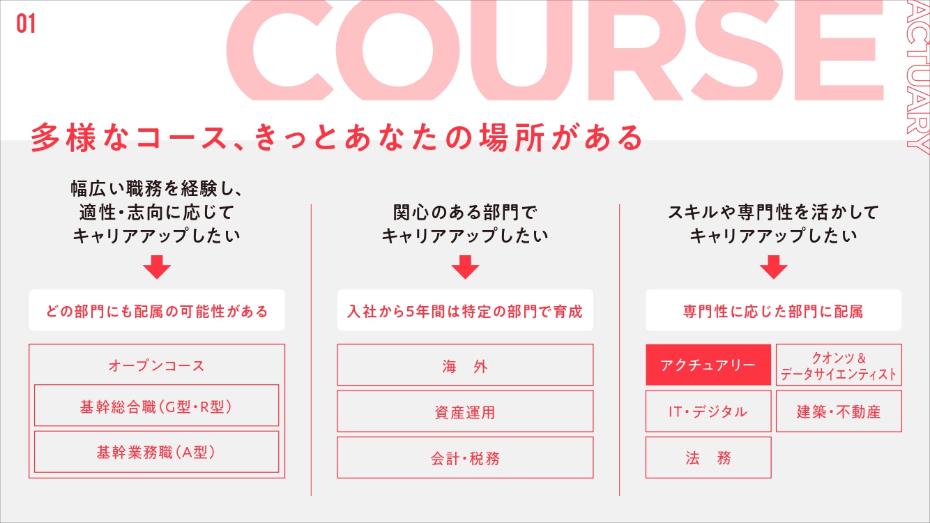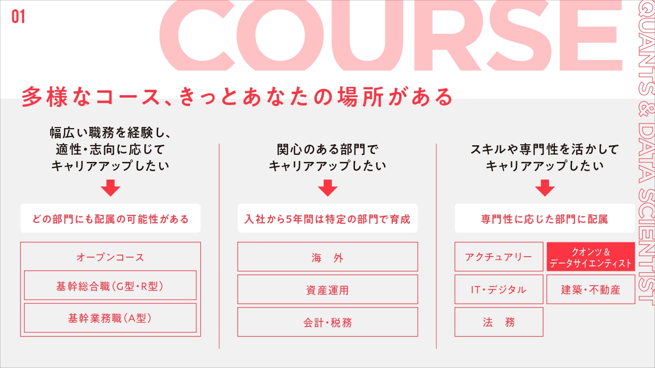 【オープンコース】基幹総合職(G型・R型)、アクチュアリーコース、クオンツ&データサイエンティストコース、建築・不動産コース、IT・デジタルコース、資産運用コース、海外コースの中からいずれか1つと併願が可能です。