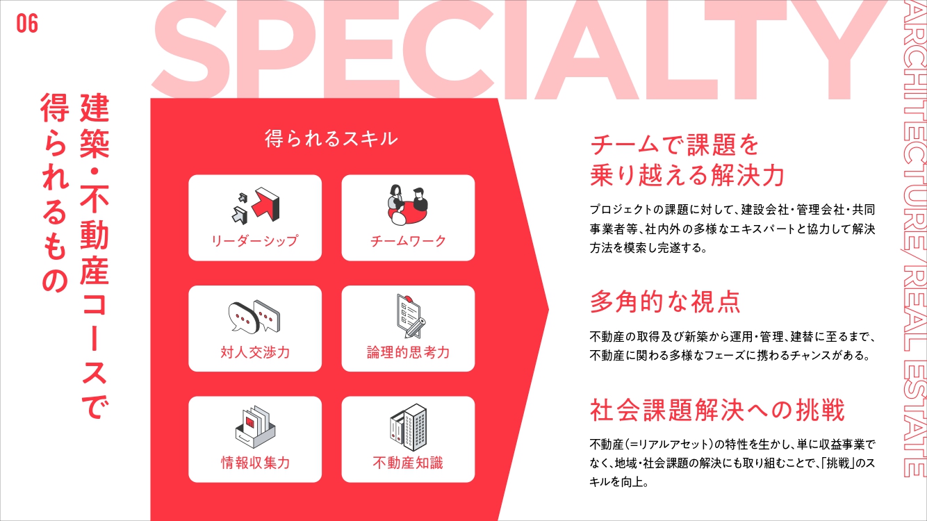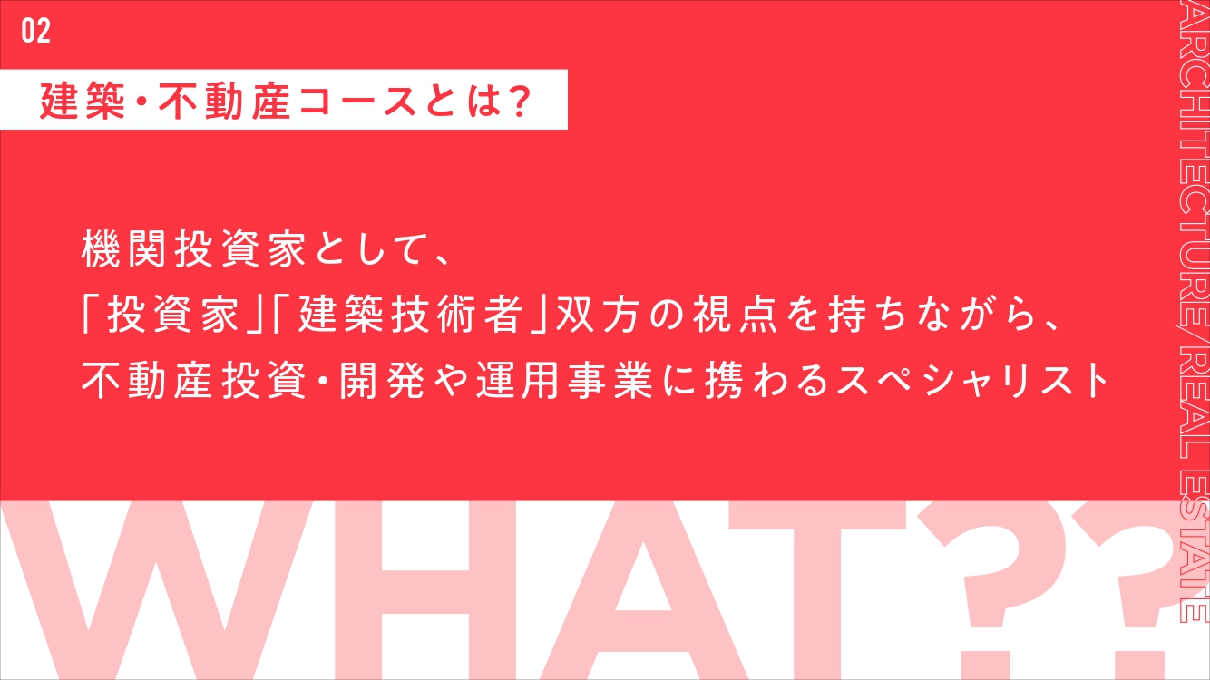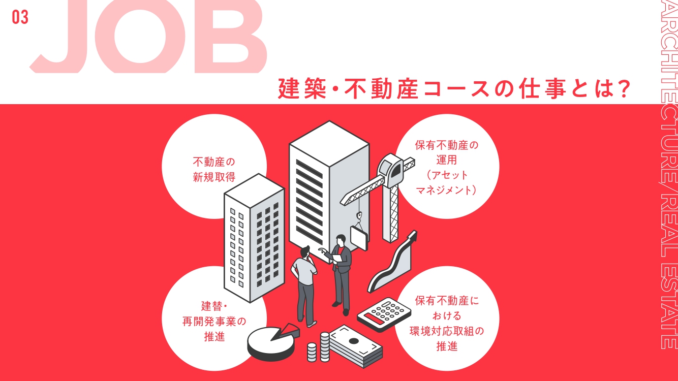 「投資家」「建築技術者」双方の視点を持ちながら、不動産投資・開発や運用事業に携わるスペシャリストとしての活躍が可能なコース