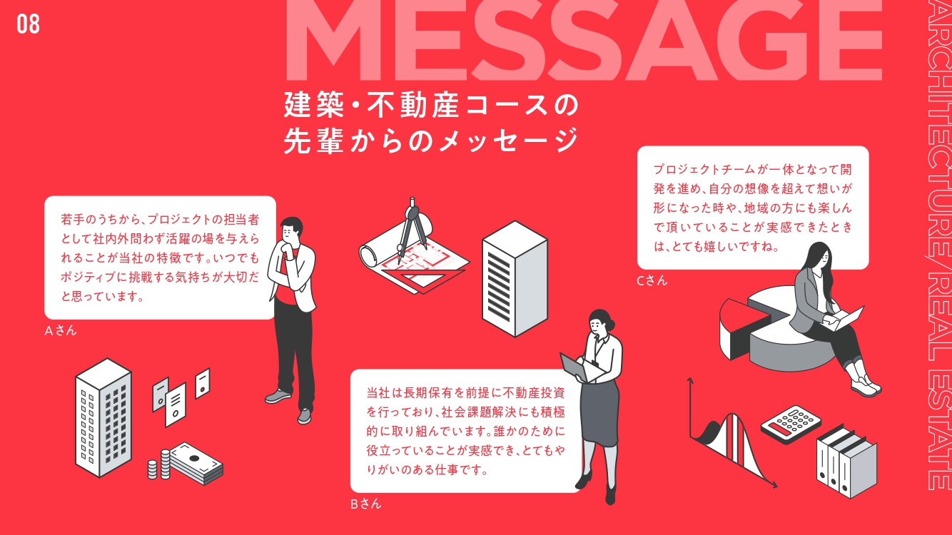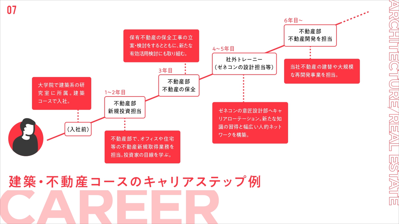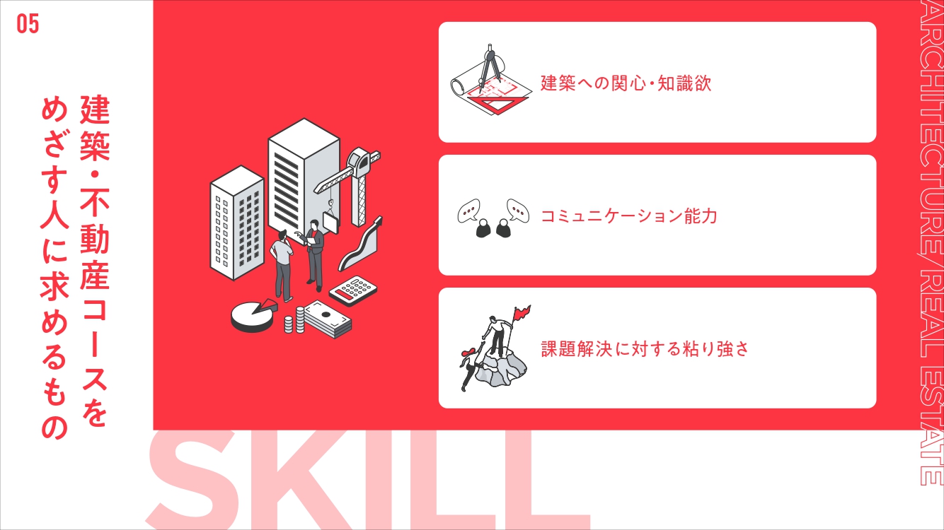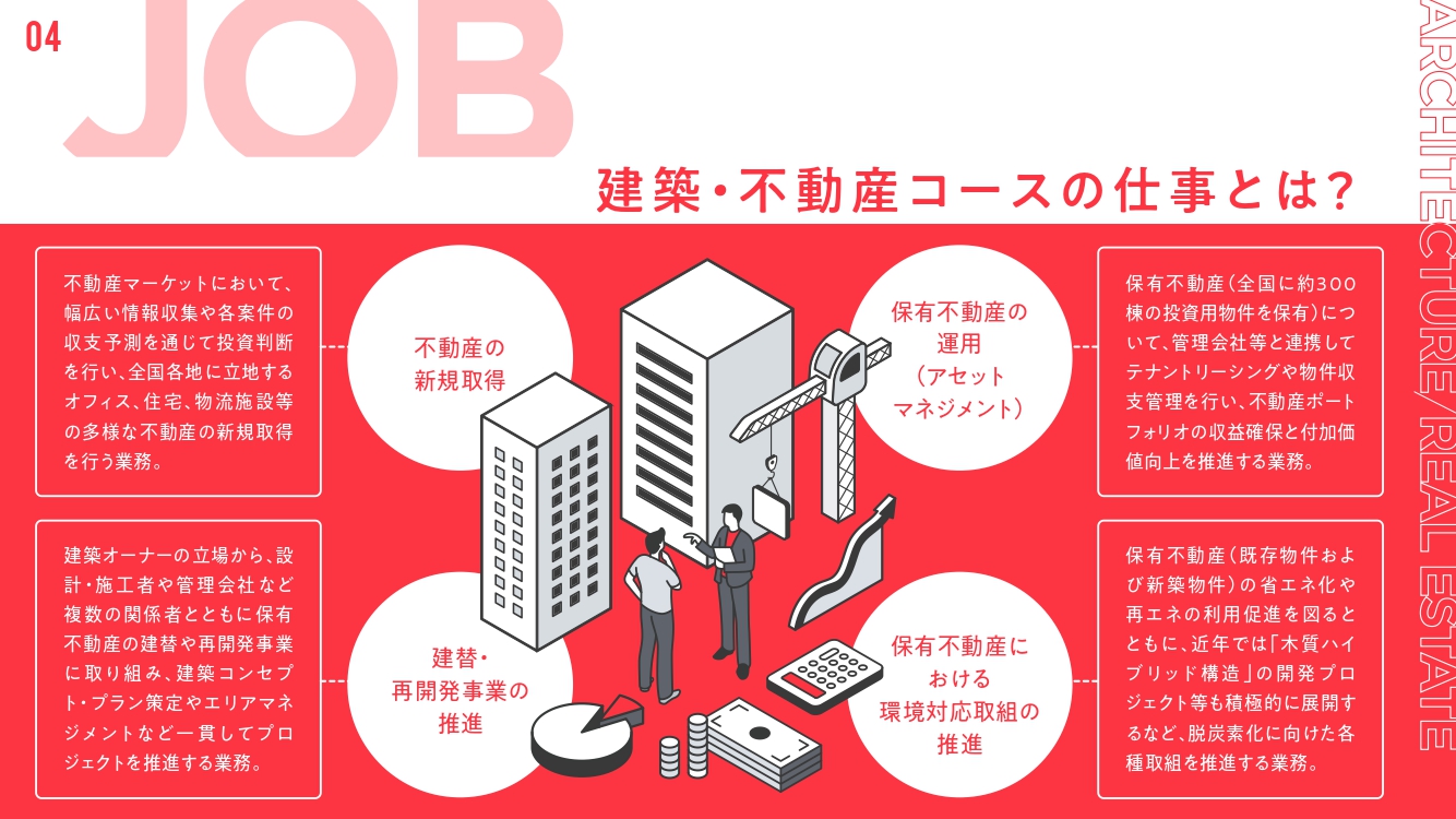 「投資家」「建築技術者」双方の視点を持ちながら、不動産投資・開発や運用事業に携わるスペシャリストとしての活躍が可能なコース