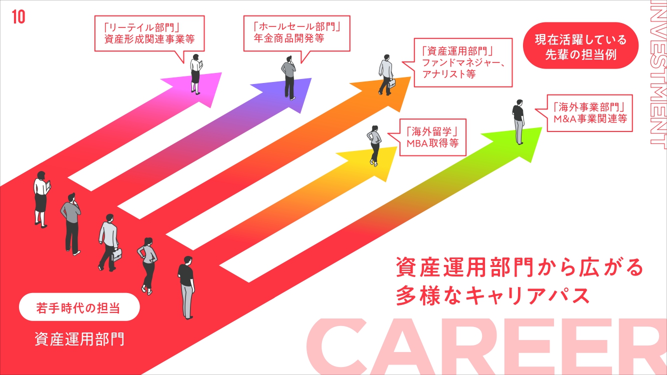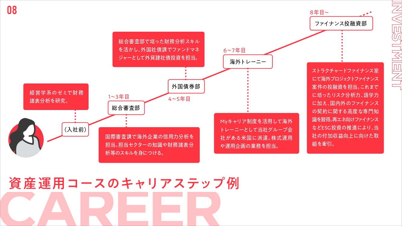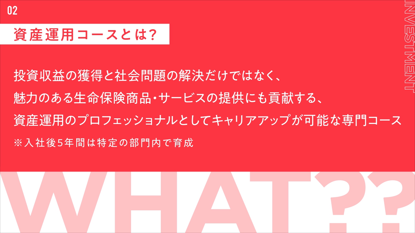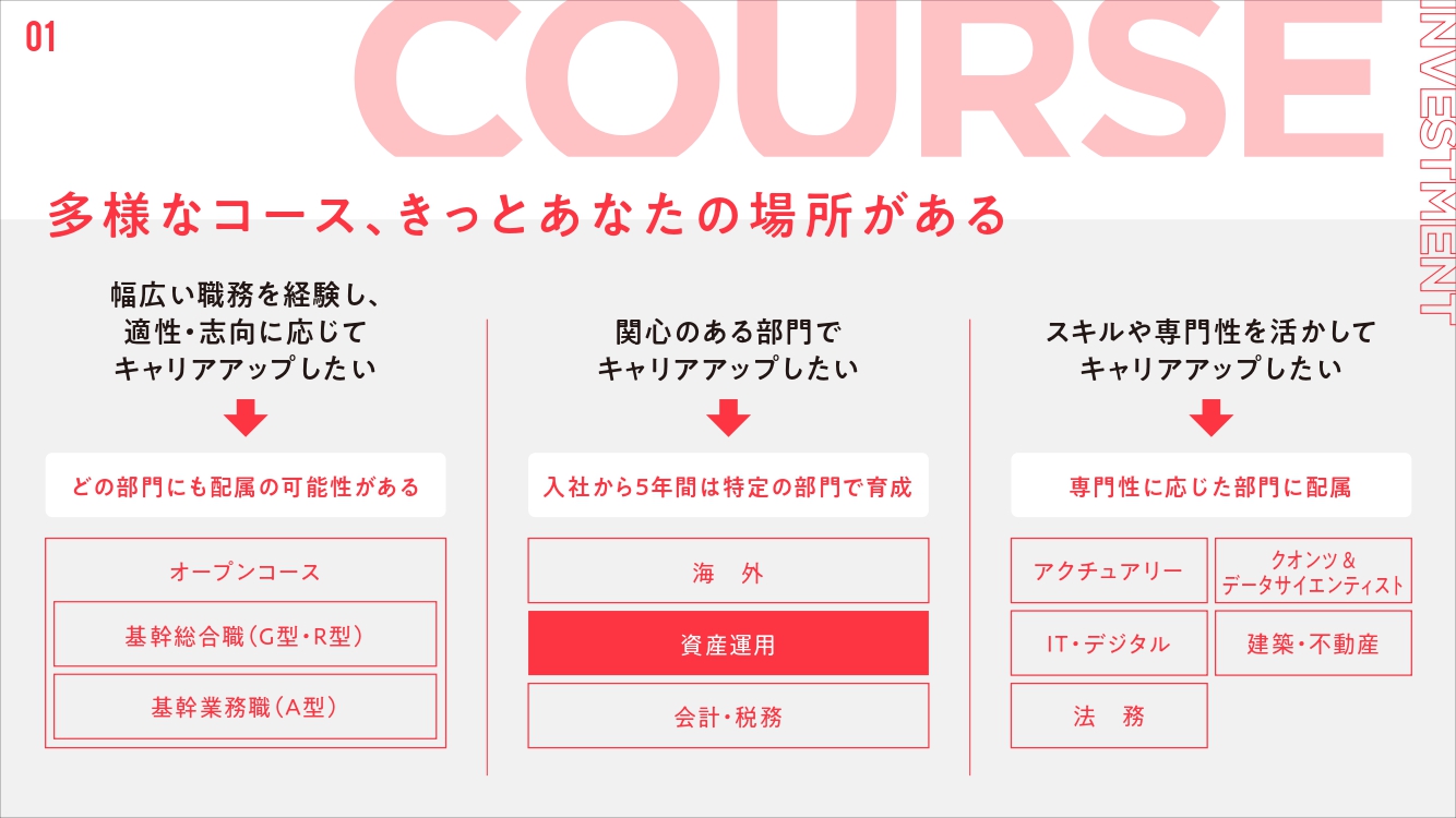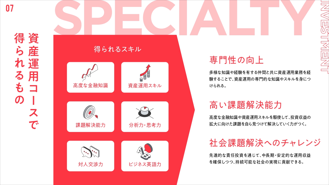 資産運用部門にて業務経験を積み、投資収益の獲得と社会課題の解決にも貢献する資産運用のスペシャリストとしてスキルアップが可能なコース