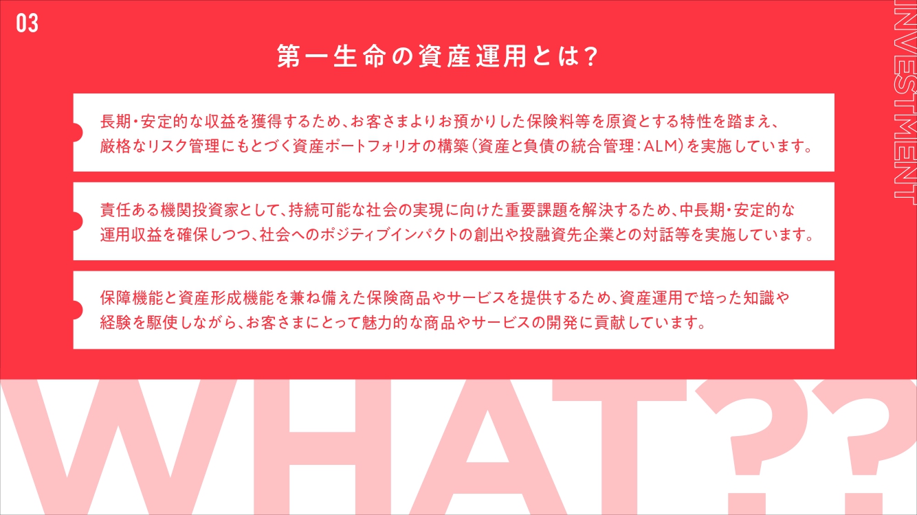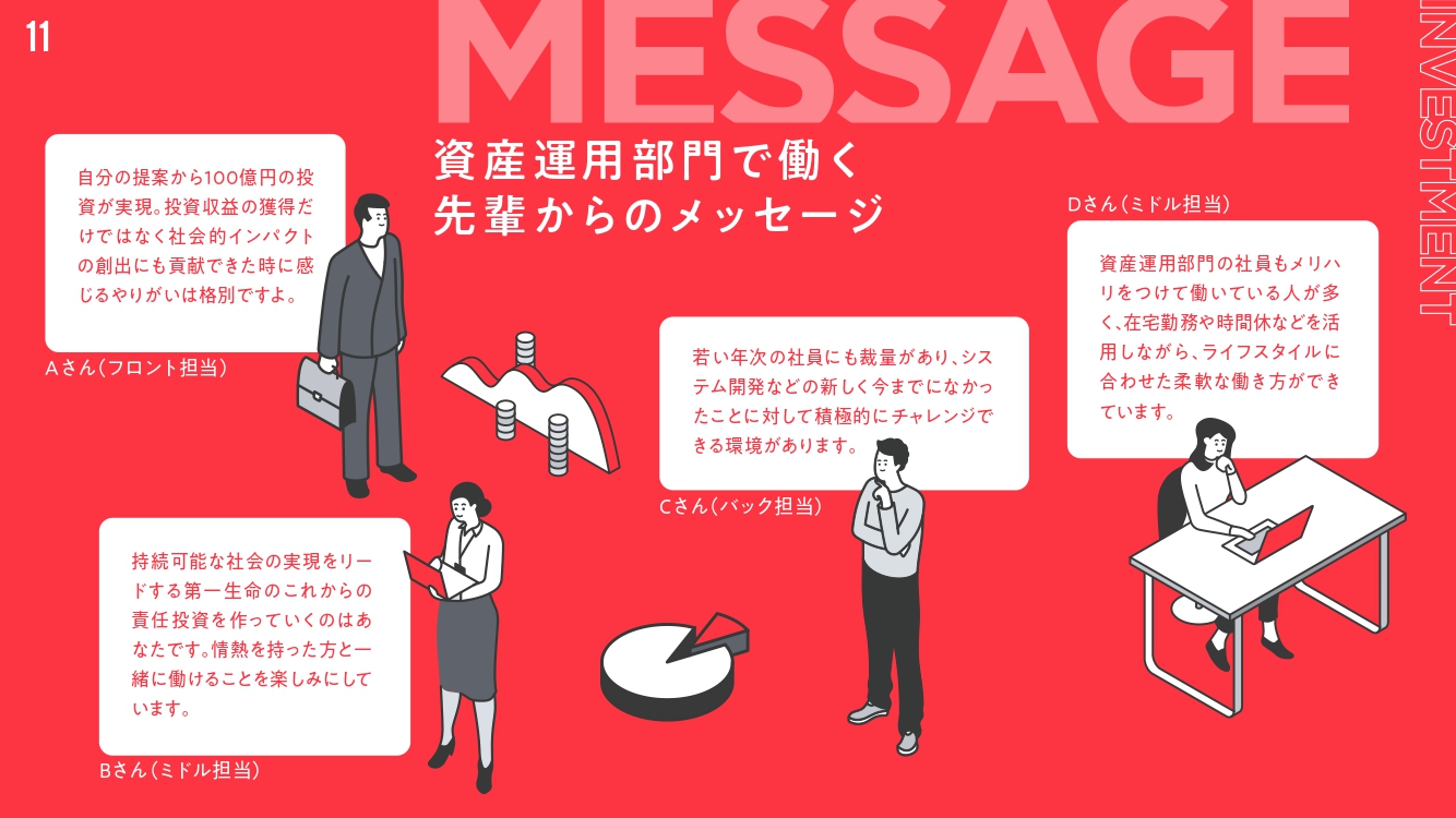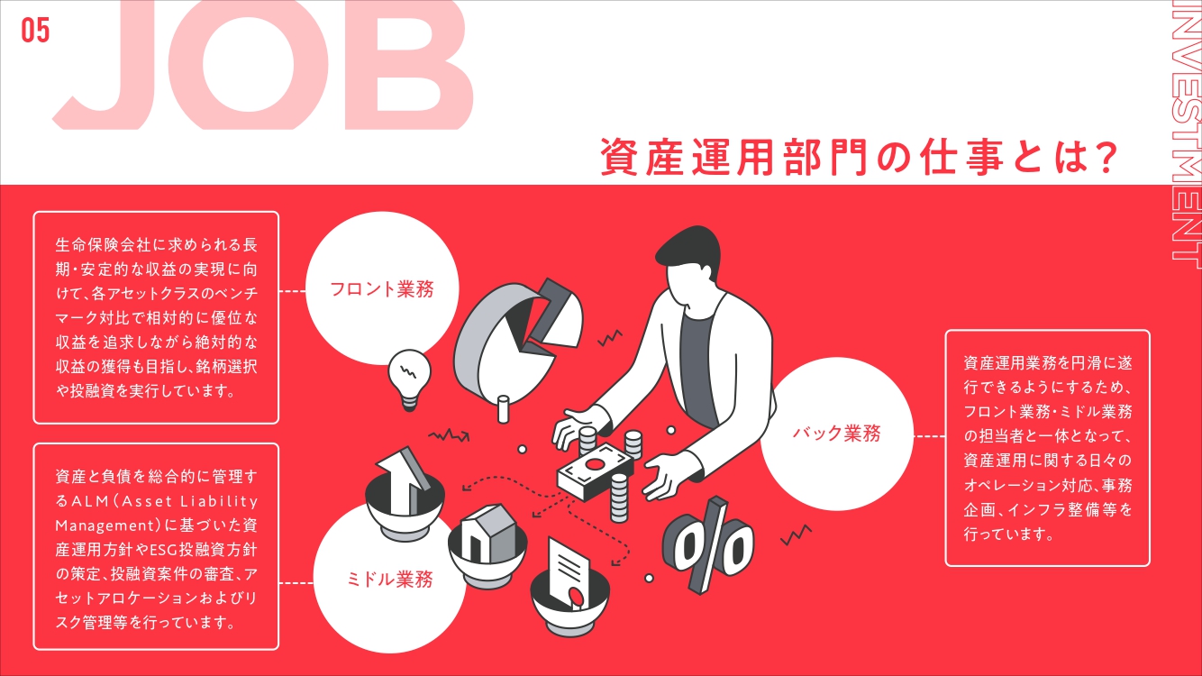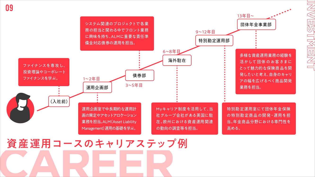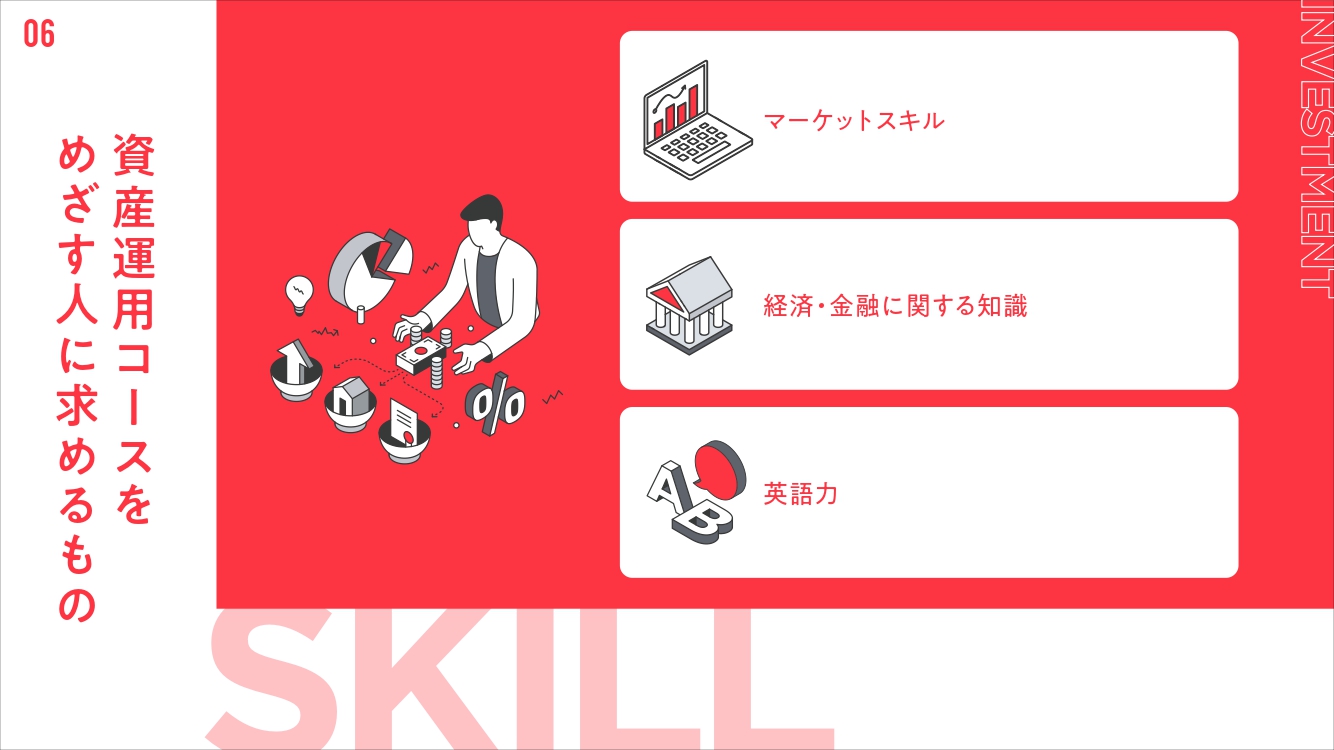 資産運用部門にて業務経験を積み、投資収益の獲得と社会課題の解決にも貢献する資産運用のスペシャリストとしてスキルアップが可能なコース