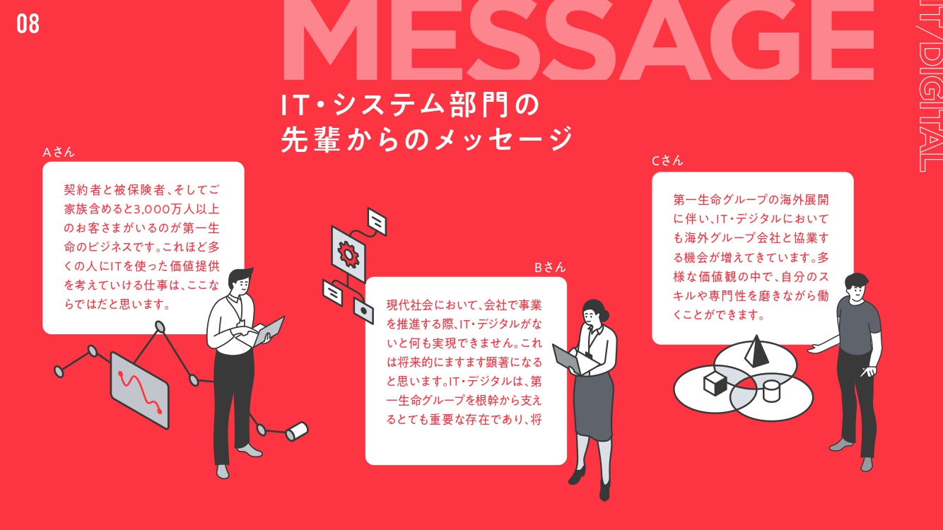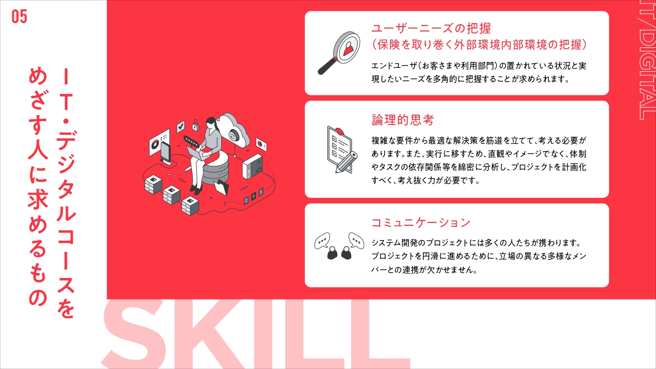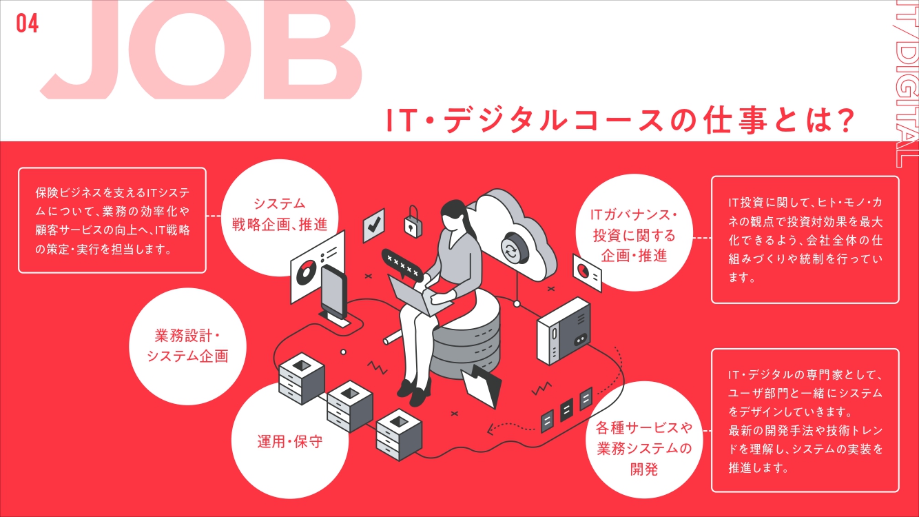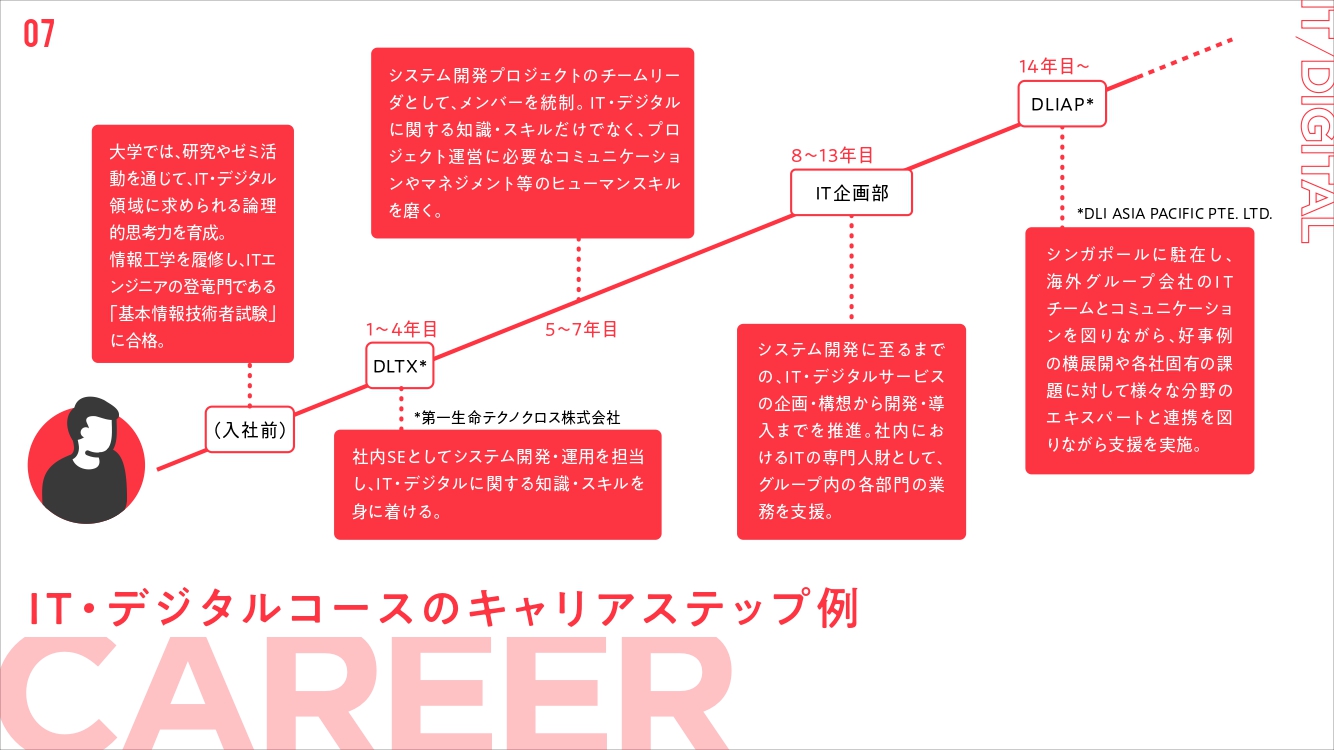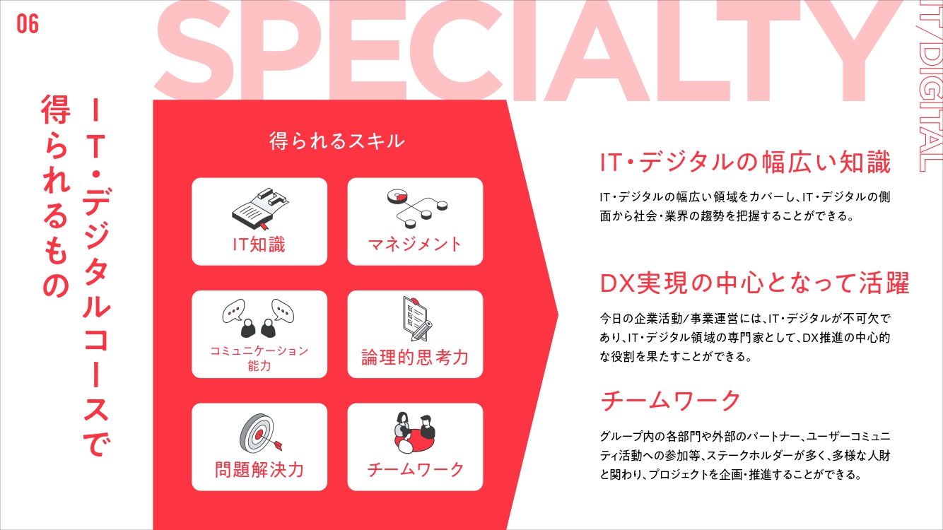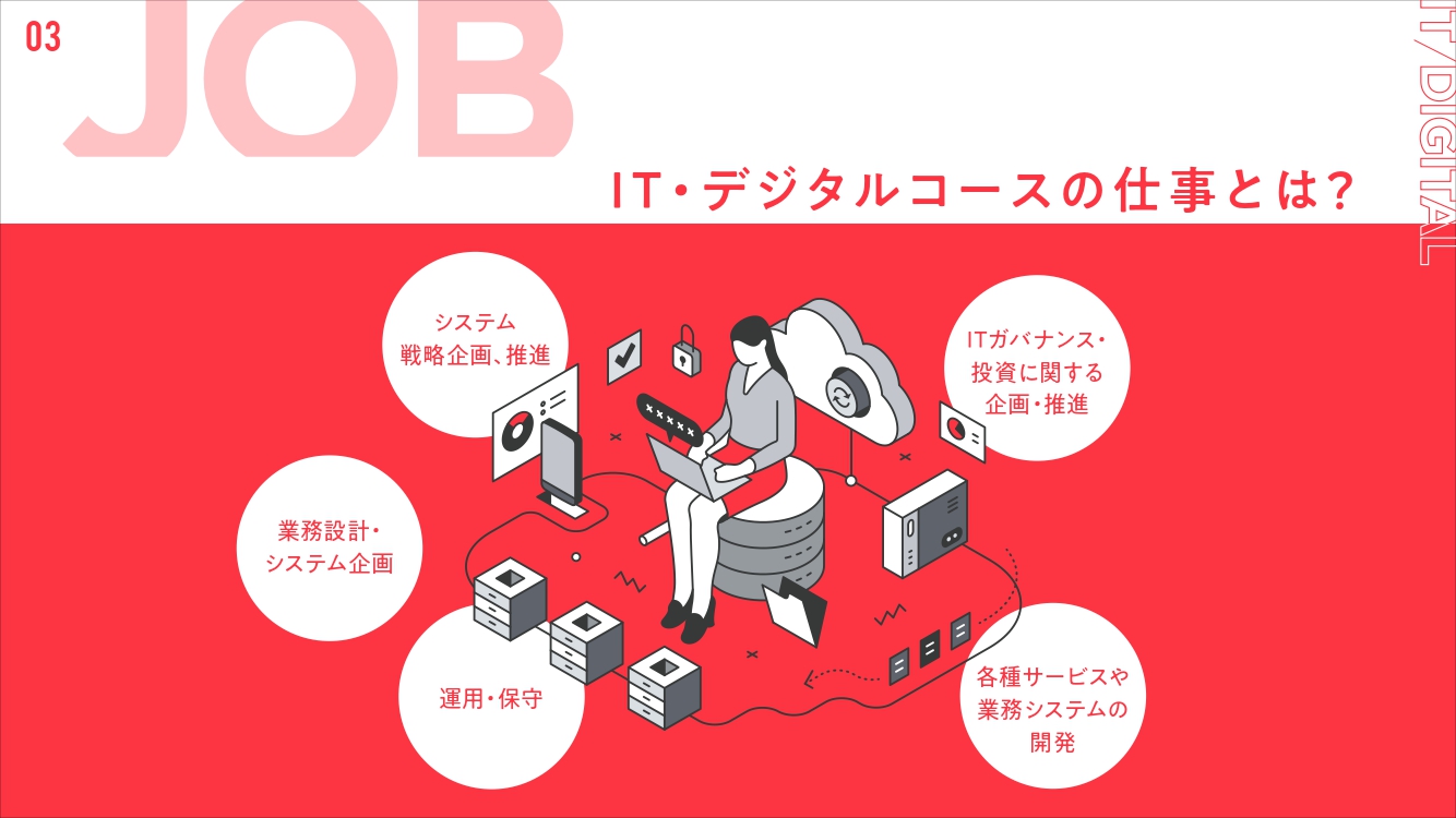 IT・システム部門にて業務経験を積み、あらゆる事業を根幹から支える各種システムの統括から、最先端技術を駆使した新規ビジネスの創造など、ITスペシャリストとしてスキルアップが可能なコース