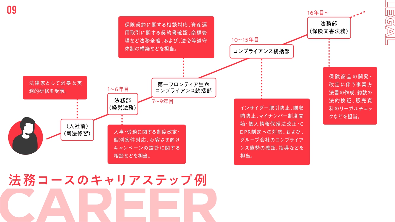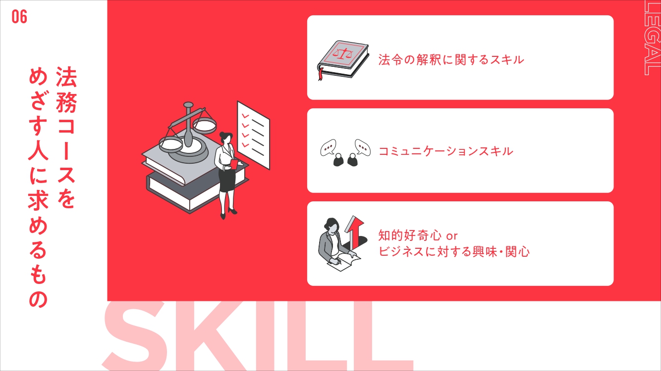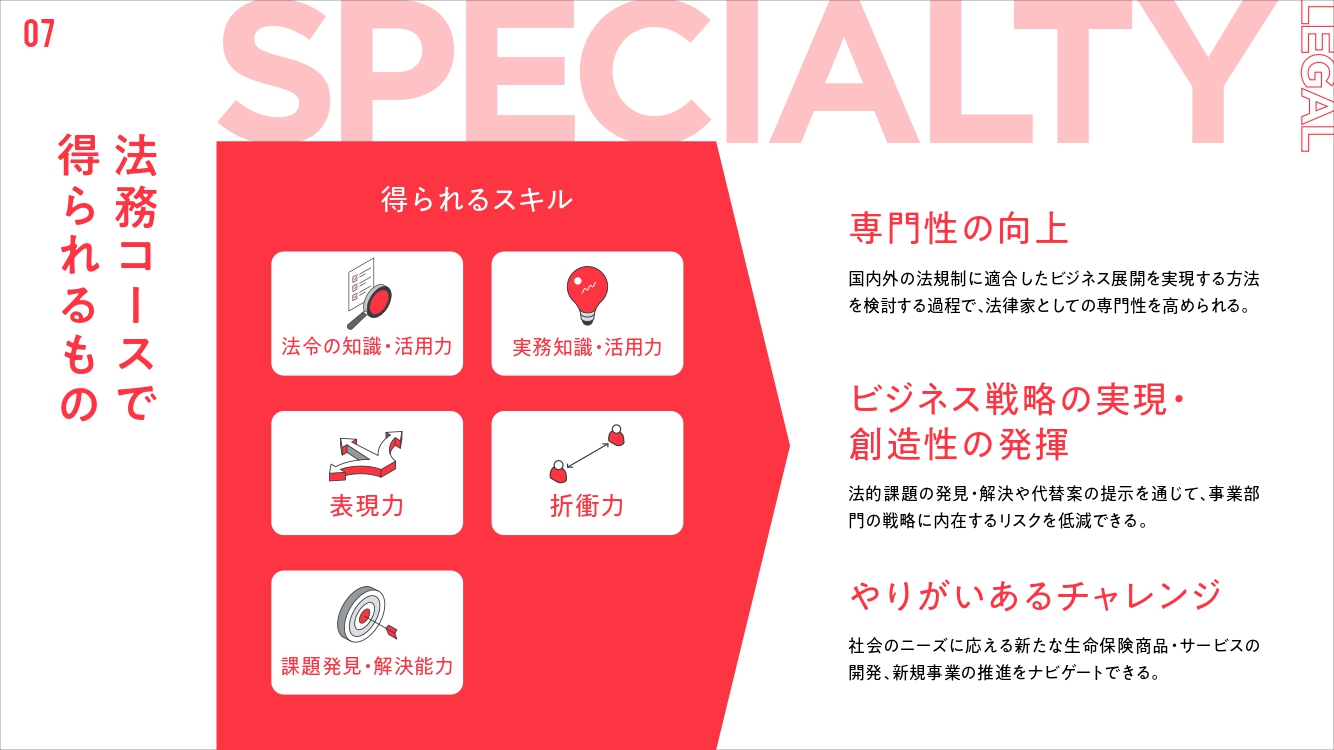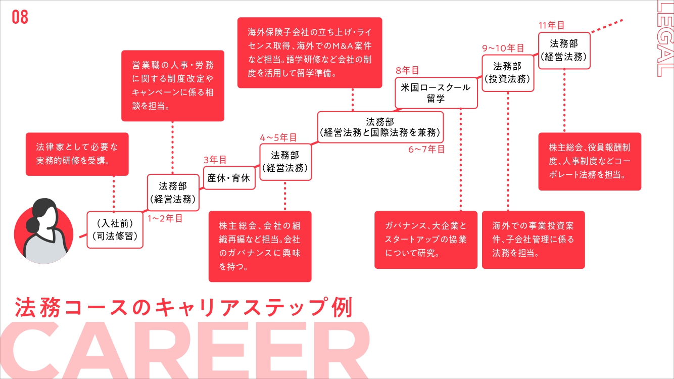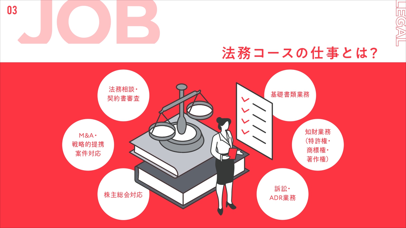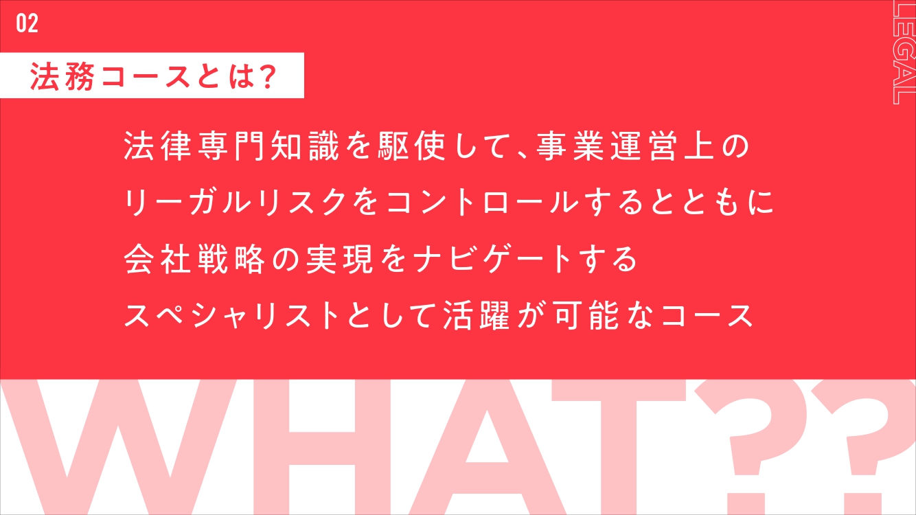 法律専門知識を駆使して、事業運営上のリーガルリスクをコントロールするとともに 会社戦略の実現をナビゲートするスペシャリストとして活躍が可能なコース
