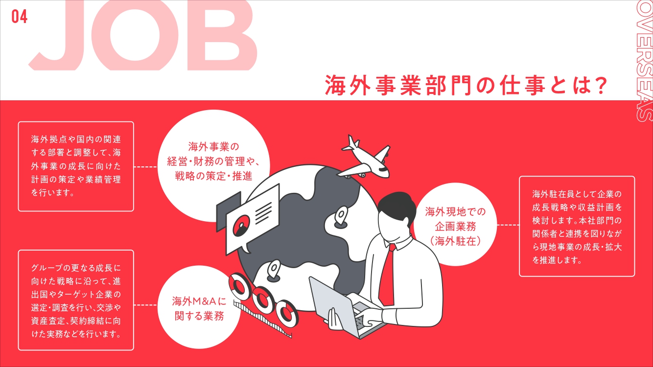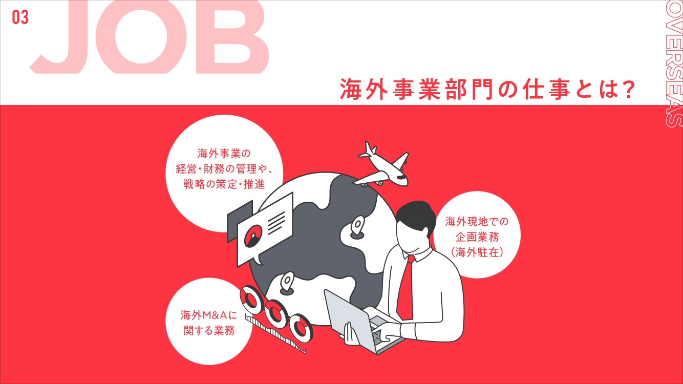 ・海外での滞在経験(留学(語学、短期含む)、帰国子女、1か月以上の渡航等)がある方が望ましい。