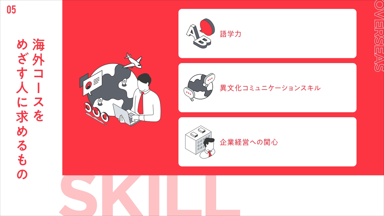 ・将来的に海外勤務を希望する場合はTOEIC700点相当以上のスコア取得が可能なレベルが望ましい。