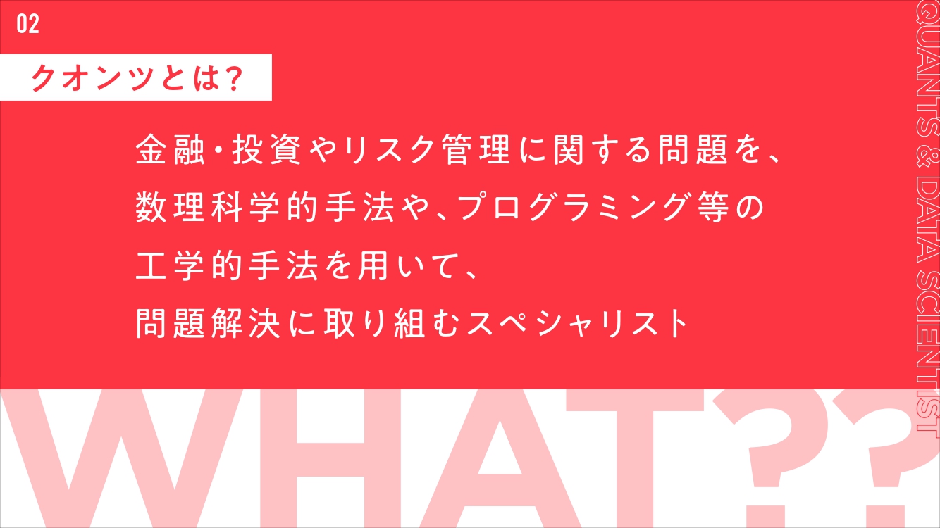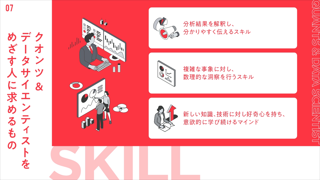 金融工学や数理ファイナンスのほか、統計学や確率論を駆使して、クオンツ&データサイエンスの観点からビジネスのソリューション提供を行うスペシャリストとして活躍が可能なコース