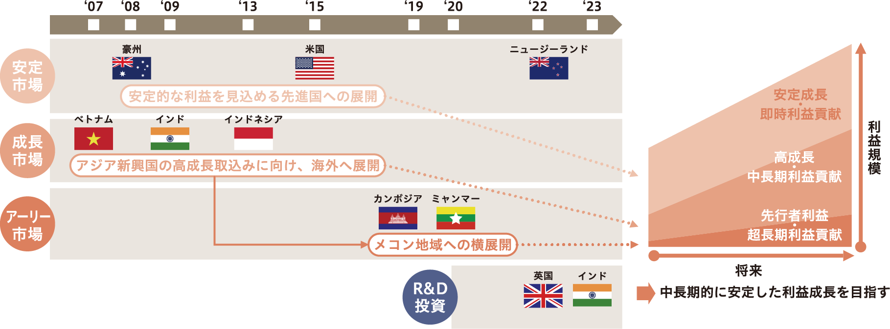 また、先進国とアジア新興国を中心とした展開により、安定的な利益貢献と中長期的な成長を享受しつつ、各国が抱える社会課題の解決や人々の安心の提供に取組んでいます。