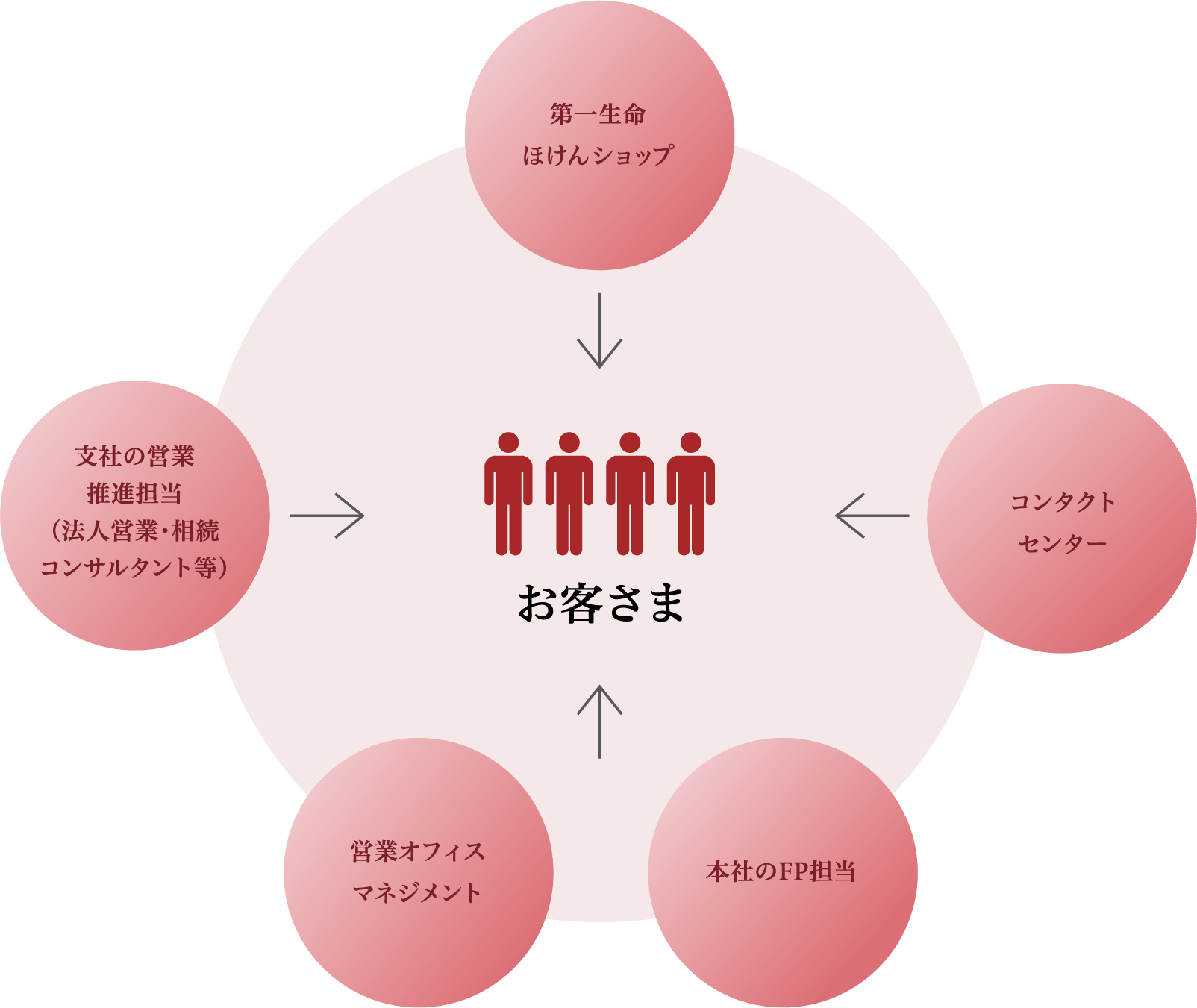 社会環境が大きく変化し、人々のライフスタイルや価値観も多様化する中、創業以来の経営理念である「一生涯のパートナー」であり続けるためには、生命保険事業のあるべき姿を常に考え続け、新たな価値を創造し続けなければなりません。そこで、生涯設計デザイナー、法人営業担当、コンタクトセンター、第一生命ほけんショップなど高い専門性を持つ社員の「強固なチームワーク」を通じ、お客さまお一人おひとりに更なる付加価値を提供していく様々な取組みを推進しています。