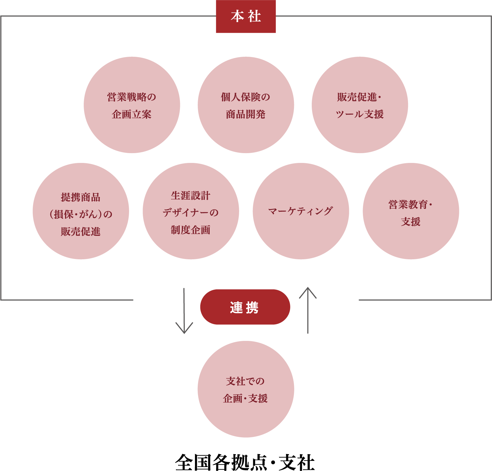 営業企画部、業務部、業務企画部、商品事業部、生涯設計教育部などの本社部門と、