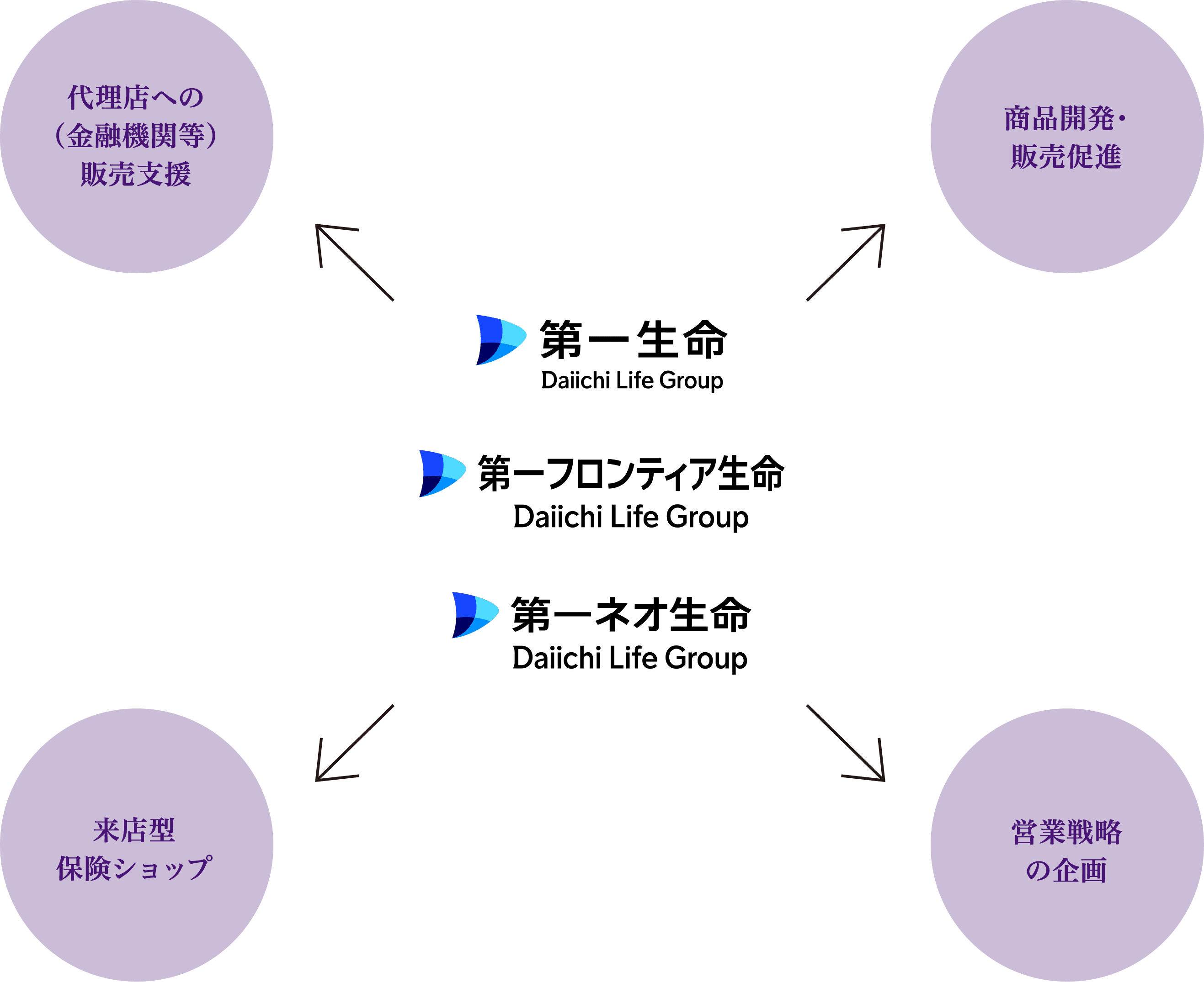 営業支援システムは、Daiichi Lifeグループの生涯設計デザイナーをはじめとして、営業オフィス、店舗窓口、スタッフなどの営業活動をサポートする各種システムです。