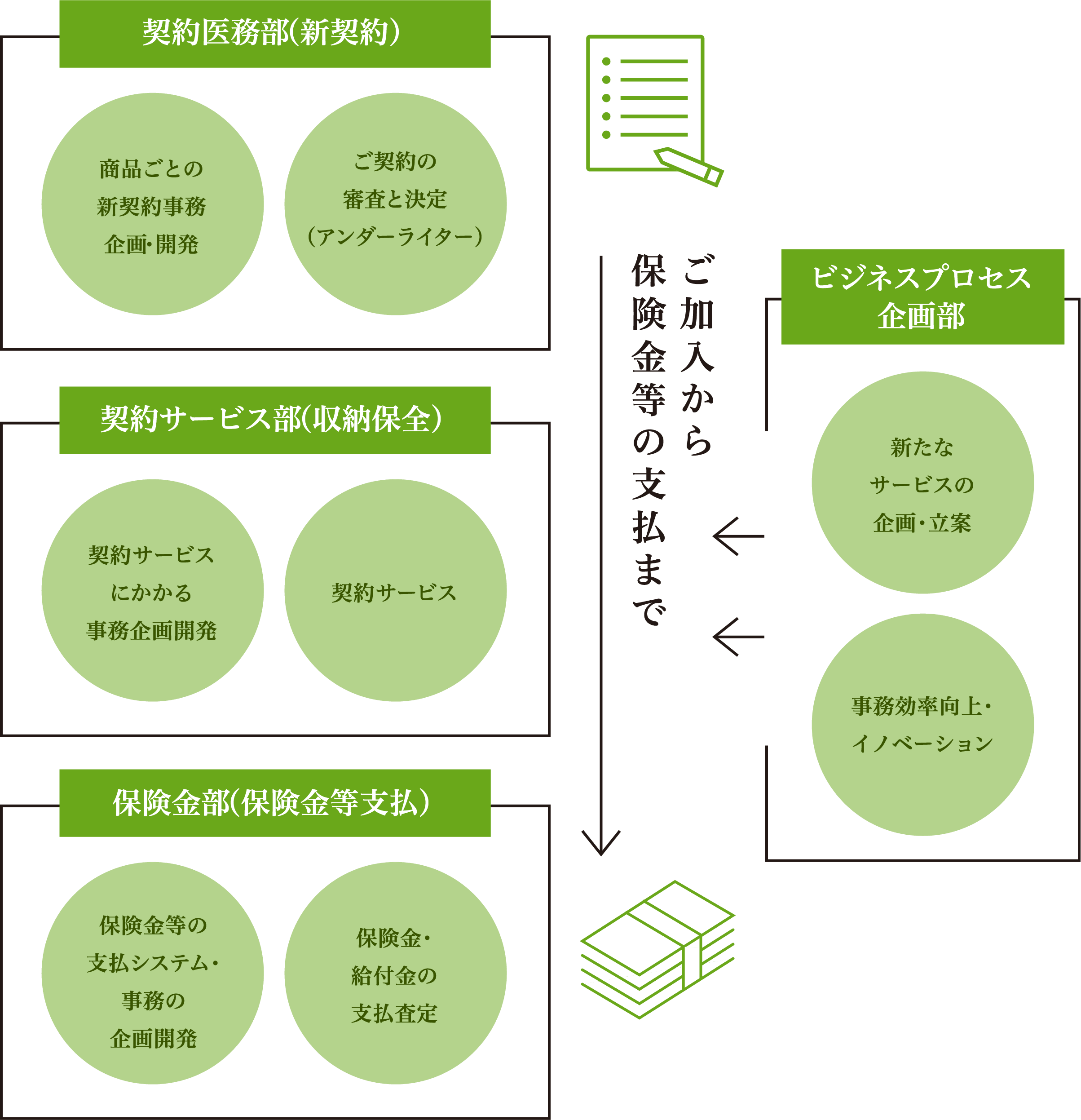 「保険金・給付金支払業務」を担当する保険金部などの部門があります。