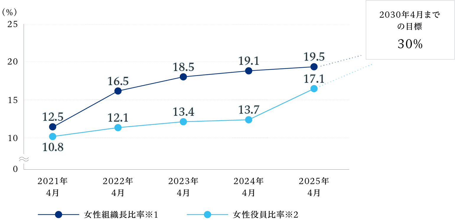 当社は女性役員比率を2030年までに30%にすることを目標に掲げる「30% Club Japan」に2019年12月に加入し、意思決定層の多様化の実現に向けて女性リーダーのパイプライン強化に取り組んでいます。